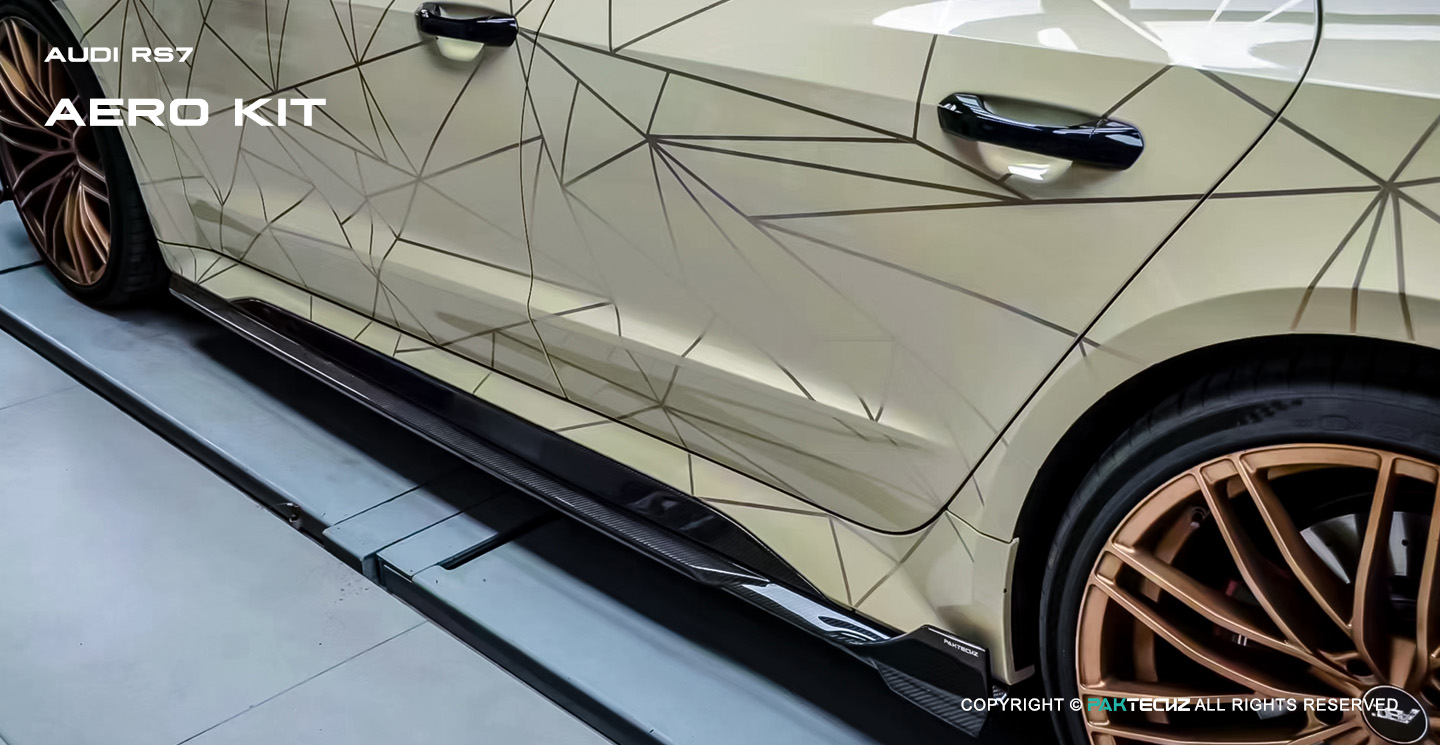 Carbon Fiber Side Skirts provide your Audi RS7 (C8) with an exceptional and sporty aesthetic. Their sleek design enhances its side profile by adding sharp contoured edges that amplify its aggressive stance, whether parked or driving; UV-protected glossy finish lends premium appearance that stands out at car shows, highway drives or motorsport events - perfect for car enthusiasts looking for luxurious styling mixed with performance upgrades while still offering practical advantages.